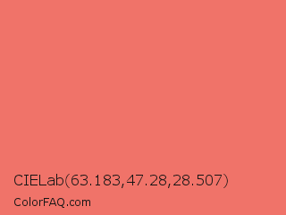 CIELab 63.183,47.28,28.507 Color is a light red color and the nearest color is Coral Reef Hipster Salmon #fd7c6e. Hex code #f07369 and RGB value is rgb(240,115,105). In RGB color space, this color is composed of 94% red, 45% green, 41% blue, In CMYK color space, this color is composed of 0% cyan, 52% magenta, 56% yellow , 6% black , In HSL color space, this color has a hue angle of 4° , 82% saturation and 68% lightness.