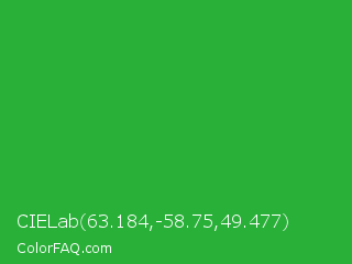 CIELab 63.184,-58.75,49.477 Color is a normal green color and the nearest color is Wageningen Green #34b233. Hex code #29b038 and RGB value is rgb(41,176,56). In RGB color space, this color is composed of 16% red, 69% green, 22% blue, In CMYK color space, this color is composed of 77% cyan, 0% magenta, 68% yellow , 31% black , In HSL color space, this color has a hue angle of 127° , 62% saturation and 43% lightness.