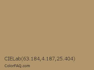 CIELab 63.184,4.187,25.404 Color is a normal orange color and the nearest color is Sandal #aa8d6f. Hex code #b0956c and RGB value is rgb(176,149,108). In RGB color space, this color is composed of 69% red, 58% green, 42% blue, In CMYK color space, this color is composed of 0% cyan, 15% magenta, 39% yellow , 31% black , In HSL color space, this color has a hue angle of 36° , 30% saturation and 56% lightness.