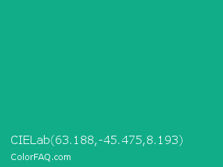 CIELab 63.188,-45.475,8.193 Color is a normal cyan color and the nearest color is Mountain Meadow Crayola #1ab385. Hex code #11ad89 and RGB value is rgb(17,173,137). In RGB color space, this color is composed of 7% red, 68% green, 54% blue, In CMYK color space, this color is composed of 90% cyan, 0% magenta, 21% yellow , 32% black , In HSL color space, this color has a hue angle of 166° , 82% saturation and 37% lightness.