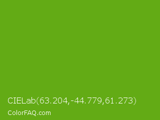 CIELab 63.204,-44.779,61.273 Color is a normal green color and the nearest color is Christi #67a712. Hex code #63ab15 and RGB value is rgb(99,171,21). In RGB color space, this color is composed of 39% red, 67% green, 8% blue, In CMYK color space, this color is composed of 42% cyan, 0% magenta, 88% yellow , 33% black , In HSL color space, this color has a hue angle of 89° , 78% saturation and 38% lightness.
