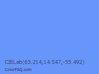 CIELab 63.214,14.547,-55.492 Color is a light blue color and the nearest color is Cornflower Blue #6495ed. Hex code #6996fc and RGB value is rgb(105,150,252). In RGB color space, this color is composed of 41% red, 59% green, 99% blue, In CMYK color space, this color is composed of 58% cyan, 40% magenta, 0% yellow , 1% black , In HSL color space, this color has a hue angle of 222° , 96% saturation and 70% lightness.