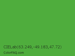 CIELab 63.249,-49.183,47.72 Color is a normal green color and the nearest color is Apple #4fa83d. Hex code #4fad3d and RGB value is rgb(79,173,61). In RGB color space, this color is composed of 31% red, 68% green, 24% blue, In CMYK color space, this color is composed of 54% cyan, 0% magenta, 65% yellow , 32% black , In HSL color space, this color has a hue angle of 110° , 48% saturation and 46% lightness.