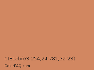 CIELab 63.254,24.781,32.23 Color is a normal orange color and the nearest color is Raw Sienna #d68a59. Hex code #d28761 and RGB value is rgb(210,135,97). In RGB color space, this color is composed of 82% red, 53% green, 38% blue, In CMYK color space, this color is composed of 0% cyan, 36% magenta, 54% yellow , 18% black , In HSL color space, this color has a hue angle of 20° , 56% saturation and 60% lightness.