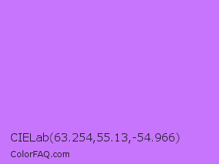 CIELab 63.254,55.13,-54.966 Color is a light purple color and the nearest color is Heliotrope #df73ff. Hex code #c775fc and RGB value is rgb(199,117,252). In RGB color space, this color is composed of 78% red, 46% green, 99% blue, In CMYK color space, this color is composed of 21% cyan, 54% magenta, 0% yellow , 1% black , In HSL color space, this color has a hue angle of 276° , 96% saturation and 72% lightness.
