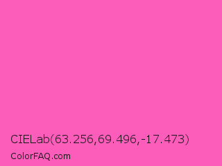 CIELab 63.256,69.496,-17.473 Color is a light magenta color and the nearest color is Hot Pink #ff69b4. Hex code #fc5cba and RGB value is rgb(252,92,186). In RGB color space, this color is composed of 99% red, 36% green, 73% blue, In CMYK color space, this color is composed of 0% cyan, 63% magenta, 26% yellow , 1% black , In HSL color space, this color has a hue angle of 325° , 96% saturation and 67% lightness.