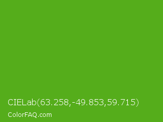 CIELab 63.258,-49.853,59.715 Color is a normal green color and the nearest color is Kelly Green #4cbb17. Hex code #55ad1b and RGB value is rgb(85,173,27). In RGB color space, this color is composed of 33% red, 68% green, 11% blue, In CMYK color space, this color is composed of 51% cyan, 0% magenta, 84% yellow , 32% black , In HSL color space, this color has a hue angle of 96° , 73% saturation and 39% lightness.