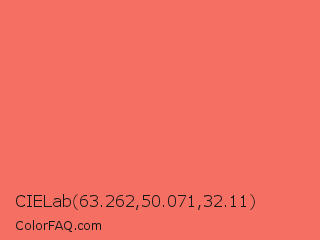 CIELab 63.262,50.071,32.11 Color is a light red color and the nearest color is Bittersweet #fe6f5e. Hex code #f57063 and RGB value is rgb(245,112,99). In RGB color space, this color is composed of 96% red, 44% green, 39% blue, In CMYK color space, this color is composed of 0% cyan, 54% magenta, 60% yellow , 4% black , In HSL color space, this color has a hue angle of 5° , 88% saturation and 67% lightness.