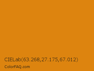 CIELab 63.268,27.175,67.012 Color is a normal orange color and the nearest color is Golden Bell #e28913. Hex code #dd840f and RGB value is rgb(221,132,15). In RGB color space, this color is composed of 87% red, 52% green, 6% blue, In CMYK color space, this color is composed of 0% cyan, 40% magenta, 93% yellow , 13% black , In HSL color space, this color has a hue angle of 34° , 87% saturation and 46% lightness.