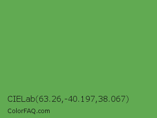 CIELab 63.26,-40.197,38.067 Color is a normal green color and the nearest color is Fruit Salad #4f9d5d. Hex code #61aa52 and RGB value is rgb(97,170,82). In RGB color space, this color is composed of 38% red, 67% green, 32% blue, In CMYK color space, this color is composed of 43% cyan, 0% magenta, 52% yellow , 33% black , In HSL color space, this color has a hue angle of 110° , 35% saturation and 49% lightness.