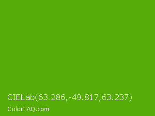 CIELab 63.286,-49.817,63.237 Color is a normal green color and the nearest color is Christi #67a712. Hex code #57ad08 and RGB value is rgb(87,173,8). In RGB color space, this color is composed of 34% red, 68% green, 3% blue, In CMYK color space, this color is composed of 50% cyan, 0% magenta, 95% yellow , 32% black , In HSL color space, this color has a hue angle of 91° , 91% saturation and 35% lightness.