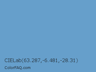 CIELab 63.287,-6.481,-28.31 Color is a normal blue color and the nearest color is Blue Gray #6699cc. Hex code #669fcb and RGB value is rgb(102,159,203). In RGB color space, this color is composed of 40% red, 62% green, 80% blue, In CMYK color space, this color is composed of 50% cyan, 22% magenta, 0% yellow , 20% black , In HSL color space, this color has a hue angle of 206° , 49% saturation and 60% lightness.