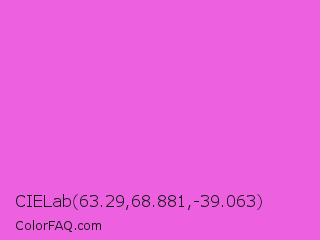 CIELab 63.29,68.881,-39.063 Color is a light magenta color and the nearest color is Orchid #da70d6. Hex code #ed61e0 and RGB value is rgb(237,97,224). In RGB color space, this color is composed of 93% red, 38% green, 88% blue, In CMYK color space, this color is composed of 0% cyan, 59% magenta, 5% yellow , 7% black , In HSL color space, this color has a hue angle of 306° , 80% saturation and 65% lightness.