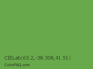 CIELab 63.2,-38.308,41.51 Color is a normal green color and the nearest color is Palm Leaf #6f9940. Hex code #68a94b and RGB value is rgb(104,169,75). In RGB color space, this color is composed of 41% red, 66% green, 29% blue, In CMYK color space, this color is composed of 38% cyan, 0% magenta, 56% yellow , 34% black , In HSL color space, this color has a hue angle of 101° , 39% saturation and 48% lightness.