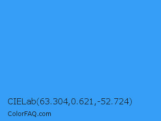 CIELab 63.304,0.621,-52.724 Color is a normal blue color and the nearest color is Brilliant Azure #3399ff. Hex code #369ef7 and RGB value is rgb(54,158,247). In RGB color space, this color is composed of 21% red, 62% green, 97% blue, In CMYK color space, this color is composed of 78% cyan, 36% magenta, 0% yellow , 3% black , In HSL color space, this color has a hue angle of 208° , 92% saturation and 59% lightness.