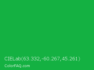 CIELab 63.332,-60.267,45.261 Color is a normal green color and the nearest color is Green Pantone #00ad43. Hex code #14b142 and RGB value is rgb(20,177,66). In RGB color space, this color is composed of 8% red, 69% green, 26% blue, In CMYK color space, this color is composed of 89% cyan, 0% magenta, 63% yellow , 31% black , In HSL color space, this color has a hue angle of 138° , 80% saturation and 39% lightness.