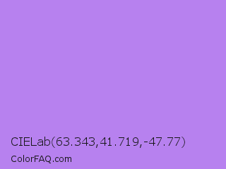 CIELab 63.343,41.719,-47.77 Color is a light violet color and the nearest color is Lavender #b57edc. Hex code #b781ef and RGB value is rgb(183,129,239). In RGB color space, this color is composed of 72% red, 51% green, 94% blue, In CMYK color space, this color is composed of 23% cyan, 46% magenta, 0% yellow , 6% black , In HSL color space, this color has a hue angle of 269° , 77% saturation and 72% lightness.