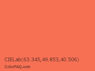CIELab 63.345,49.853,40.506 Color is a light red color and the nearest color is Persimmon #ff6b53. Hex code #f77054 and RGB value is rgb(247,112,84). In RGB color space, this color is composed of 97% red, 44% green, 33% blue, In CMYK color space, this color is composed of 0% cyan, 55% magenta, 66% yellow , 3% black , In HSL color space, this color has a hue angle of 10° , 91% saturation and 65% lightness.