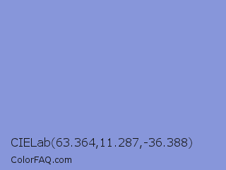 CIELab 63.364,11.287,-36.388 Color is a light blue color and the nearest color is Vista Blue #7c9ed9. Hex code #8796da and RGB value is rgb(135,150,218). In RGB color space, this color is composed of 53% red, 59% green, 85% blue, In CMYK color space, this color is composed of 38% cyan, 31% magenta, 0% yellow , 15% black , In HSL color space, this color has a hue angle of 229° , 53% saturation and 69% lightness.