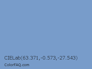 CIELab 63.371,-0.573,-27.543 Color is a light blue color and the nearest color is Dark Pastel Blue #779ecb. Hex code #789cca and RGB value is rgb(120,156,202). In RGB color space, this color is composed of 47% red, 61% green, 79% blue, In CMYK color space, this color is composed of 41% cyan, 23% magenta, 0% yellow , 21% black , In HSL color space, this color has a hue angle of 214° , 44% saturation and 63% lightness.