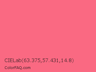 CIELab 63.375,57.431,14.8 Color is a light red color and the nearest color is Ultra Red #fc6c85. Hex code #fa6982 and RGB value is rgb(250,105,130). In RGB color space, this color is composed of 98% red, 41% green, 51% blue, In CMYK color space, this color is composed of 0% cyan, 58% magenta, 48% yellow , 2% black , In HSL color space, this color has a hue angle of 350° , 94% saturation and 70% lightness.