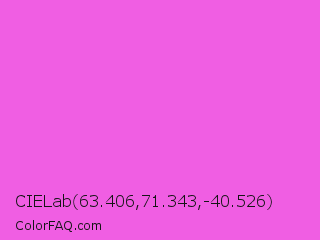 CIELab 63.406,71.343,-40.526 Color is a light magenta color and the nearest color is Purple Pizzazz #fe4eda. Hex code #f05ee3 and RGB value is rgb(240,94,227). In RGB color space, this color is composed of 94% red, 37% green, 89% blue, In CMYK color space, this color is composed of 0% cyan, 61% magenta, 5% yellow , 6% black , In HSL color space, this color has a hue angle of 305° , 83% saturation and 65% lightness.
