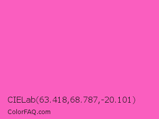 CIELab 63.418,68.787,-20.101 Color is a light magenta color and the nearest color is Light Deep Pink #ff5ccd. Hex code #fa5ebf and RGB value is rgb(250,94,191). In RGB color space, this color is composed of 98% red, 37% green, 75% blue, In CMYK color space, this color is composed of 0% cyan, 62% magenta, 24% yellow , 2% black , In HSL color space, this color has a hue angle of 323° , 94% saturation and 67% lightness.