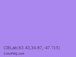 CIELab 63.43,34.87,-47.715 Color is a light indigo color and the nearest color is Dull Lavender #a899e6. Hex code #aa87ef and RGB value is rgb(170,135,239). In RGB color space, this color is composed of 67% red, 53% green, 94% blue, In CMYK color space, this color is composed of 29% cyan, 44% magenta, 0% yellow , 6% black , In HSL color space, this color has a hue angle of 260° , 76% saturation and 73% lightness.