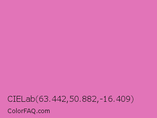 CIELab 63.442,50.882,-16.409 Color is a light magenta color and the nearest color is Middle Purple #d982b5. Hex code #e274b8 and RGB value is rgb(226,116,184). In RGB color space, this color is composed of 89% red, 45% green, 72% blue, In CMYK color space, this color is composed of 0% cyan, 49% magenta, 19% yellow , 11% black , In HSL color space, this color has a hue angle of 323° , 65% saturation and 67% lightness.