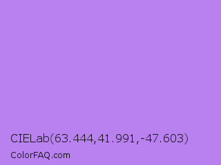 CIELab 63.444,41.991,-47.603 Color is a light violet color and the nearest color is Lavender #b57edc. Hex code #b881ef and RGB value is rgb(184,129,239). In RGB color space, this color is composed of 72% red, 51% green, 94% blue, In CMYK color space, this color is composed of 23% cyan, 46% magenta, 0% yellow , 6% black , In HSL color space, this color has a hue angle of 270° , 77% saturation and 72% lightness.