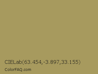 CIELab 63.454,-3.897,33.155 Color is a normal yellow color and the nearest color is Teak #b19461. Hex code #a79a5e and RGB value is rgb(167,154,94). In RGB color space, this color is composed of 65% red, 60% green, 37% blue, In CMYK color space, this color is composed of 0% cyan, 8% magenta, 44% yellow , 35% black , In HSL color space, this color has a hue angle of 49° , 29% saturation and 51% lightness.
