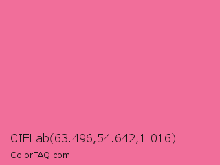 CIELab 63.496,54.642,1.016 Color is a light rose color and the nearest color is Cyclamen #f56fa1. Hex code #f16e9a and RGB value is rgb(241,110,154). In RGB color space, this color is composed of 95% red, 43% green, 60% blue, In CMYK color space, this color is composed of 0% cyan, 54% magenta, 36% yellow , 5% black , In HSL color space, this color has a hue angle of 340° , 82% saturation and 69% lightness.