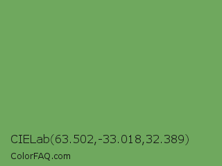 CIELab 63.502,-33.018,32.389 Color is a normal green color and the nearest color is Asparagus Green #7ba05b. Hex code #6fa85e and RGB value is rgb(111,168,94). In RGB color space, this color is composed of 44% red, 66% green, 37% blue, In CMYK color space, this color is composed of 34% cyan, 0% magenta, 44% yellow , 34% black , In HSL color space, this color has a hue angle of 106° , 30% saturation and 51% lightness.