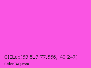CIELab 63.517,77.566,-40.247 Color is a light magenta color and the nearest color is Purple Pizzazz #fe4eda. Hex code #fa54e3 and RGB value is rgb(250,84,227). In RGB color space, this color is composed of 98% red, 33% green, 89% blue, In CMYK color space, this color is composed of 0% cyan, 66% magenta, 9% yellow , 2% black , In HSL color space, this color has a hue angle of 308° , 94% saturation and 65% lightness.