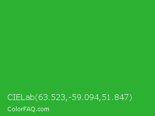 CIELab 63.523,-59.094,51.847 Color is a normal green color and the nearest color is Wageningen Green #34b233. Hex code #2cb133 and RGB value is rgb(44,177,51). In RGB color space, this color is composed of 17% red, 69% green, 20% blue, In CMYK color space, this color is composed of 75% cyan, 0% magenta, 71% yellow , 31% black , In HSL color space, this color has a hue angle of 123° , 60% saturation and 43% lightness.