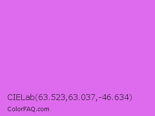 CIELab 63.523,63.037,-46.634 Color is a light magenta color and the nearest color is Heliotrope #df73ff. Hex code #de6bee and RGB value is rgb(222,107,238). In RGB color space, this color is composed of 87% red, 42% green, 93% blue, In CMYK color space, this color is composed of 7% cyan, 55% magenta, 0% yellow , 7% black , In HSL color space, this color has a hue angle of 293° , 79% saturation and 68% lightness.