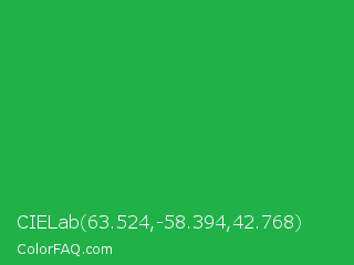CIELab 63.524,-58.394,42.768 Color is a normal green color and the nearest color is Wageningen Green #34b233. Hex code #20b148 and RGB value is rgb(32,177,72). In RGB color space, this color is composed of 13% red, 69% green, 28% blue, In CMYK color space, this color is composed of 82% cyan, 0% magenta, 59% yellow , 31% black , In HSL color space, this color has a hue angle of 137° , 69% saturation and 41% lightness.