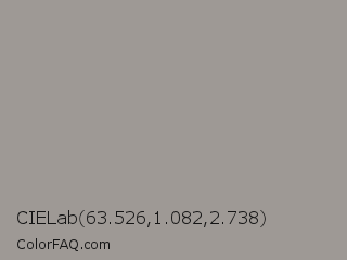 CIELab 63.526,1.082,2.738 Color is a normal orange color and the nearest color is Spanish Gray #989898. Hex code #9e9995 and RGB value is rgb(158,153,149). In RGB color space, this color is composed of 62% red, 60% green, 58% blue, In CMYK color space, this color is composed of 0% cyan, 3% magenta, 6% yellow , 38% black , In HSL color space, this color has a hue angle of 27° , 4% saturation and 60% lightness.