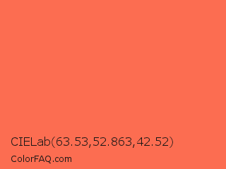 CIELab 63.53,52.863,42.52 Color is a light red color and the nearest color is Persimmon #ff6b53. Hex code #fc6d51 and RGB value is rgb(252,109,81). In RGB color space, this color is composed of 99% red, 43% green, 32% blue, In CMYK color space, this color is composed of 0% cyan, 57% magenta, 68% yellow , 1% black , In HSL color space, this color has a hue angle of 10° , 97% saturation and 65% lightness.