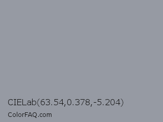 CIELab 63.54,0.378,-5.204 Color is a light blue color and the nearest color is Manatee #979aaa. Hex code #969aa3 and RGB value is rgb(150,154,163). In RGB color space, this color is composed of 59% red, 60% green, 64% blue, In CMYK color space, this color is composed of 8% cyan, 6% magenta, 0% yellow , 36% black , In HSL color space, this color has a hue angle of 222° , 7% saturation and 61% lightness.