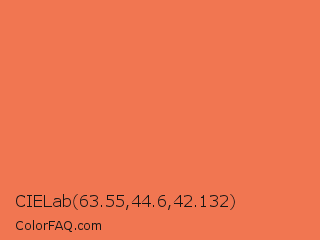 CIELab 63.55,44.6,42.132 Color is a light red color and the nearest color is Burnt Sienna #e97451. Hex code #f17651 and RGB value is rgb(241,118,81). In RGB color space, this color is composed of 95% red, 46% green, 32% blue, In CMYK color space, this color is composed of 0% cyan, 51% magenta, 66% yellow , 5% black , In HSL color space, this color has a hue angle of 14° , 85% saturation and 63% lightness.
