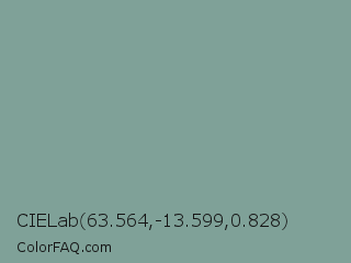 CIELab 63.564,-13.599,0.828 Color is a normal cyan color and the nearest color is Sea Nymph #78a39c. Hex code #7fa198 and RGB value is rgb(127,161,152). In RGB color space, this color is composed of 50% red, 63% green, 60% blue, In CMYK color space, this color is composed of 21% cyan, 0% magenta, 6% yellow , 37% black , In HSL color space, this color has a hue angle of 164° , 15% saturation and 56% lightness.