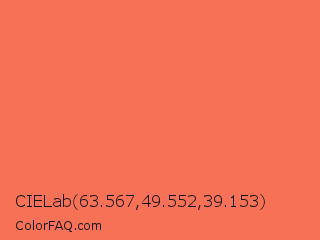 CIELab 63.567,49.552,39.153 Color is a light red color and the nearest color is Bittersweet #fe6f5e. Hex code #f77157 and RGB value is rgb(247,113,87). In RGB color space, this color is composed of 97% red, 44% green, 34% blue, In CMYK color space, this color is composed of 0% cyan, 54% magenta, 65% yellow , 3% black , In HSL color space, this color has a hue angle of 10° , 91% saturation and 65% lightness.