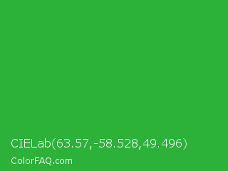CIELab 63.57,-58.528,49.496 Color is a normal green color and the nearest color is Wageningen Green #34b233. Hex code #2cb139 and RGB value is rgb(44,177,57). In RGB color space, this color is composed of 17% red, 69% green, 22% blue, In CMYK color space, this color is composed of 75% cyan, 0% magenta, 68% yellow , 31% black , In HSL color space, this color has a hue angle of 126° , 60% saturation and 43% lightness.