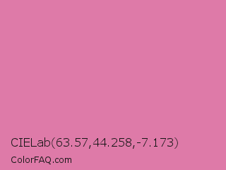 CIELab 63.57,44.258,-7.173 Color is a light rose color and the nearest color is Thulian Pink #de6fa1. Hex code #de7aa8 and RGB value is rgb(222,122,168). In RGB color space, this color is composed of 87% red, 48% green, 66% blue, In CMYK color space, this color is composed of 0% cyan, 45% magenta, 24% yellow , 13% black , In HSL color space, this color has a hue angle of 332° , 60% saturation and 67% lightness.