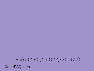 CIELab 63.586,16.822,-26.972 Color is a light indigo color and the nearest color is Blue Bell Crayola #9999cc. Hex code #a092ca and RGB value is rgb(160,146,202). In RGB color space, this color is composed of 63% red, 57% green, 79% blue, In CMYK color space, this color is composed of 21% cyan, 28% magenta, 0% yellow , 21% black , In HSL color space, this color has a hue angle of 255° , 35% saturation and 68% lightness.