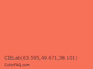 CIELab 63.595,49.671,38.101 Color is a light red color and the nearest color is Bittersweet #fe6f5e. Hex code #f77159 and RGB value is rgb(247,113,89). In RGB color space, this color is composed of 97% red, 44% green, 35% blue, In CMYK color space, this color is composed of 0% cyan, 54% magenta, 64% yellow , 3% black , In HSL color space, this color has a hue angle of 9° , 91% saturation and 66% lightness.