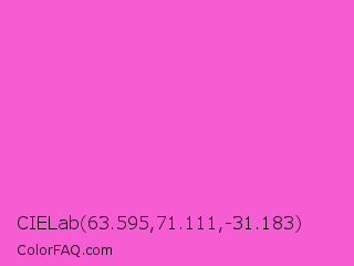 CIELab 63.595,71.111,-31.183 Color is a light magenta color and the nearest color is Light Deep Pink #ff5ccd. Hex code #f75dd3 and RGB value is rgb(247,93,211). In RGB color space, this color is composed of 97% red, 36% green, 83% blue, In CMYK color space, this color is composed of 0% cyan, 62% magenta, 15% yellow , 3% black , In HSL color space, this color has a hue angle of 314° , 91% saturation and 67% lightness.