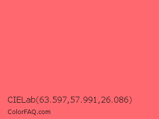 CIELab 63.597,57.991,26.086 Color is a light red color and the nearest color is Begonia #fa6e79. Hex code #ff686f and RGB value is rgb(255,104,111). In RGB color space, this color is composed of 100% red, 41% green, 44% blue, In CMYK color space, this color is composed of 0% cyan, 59% magenta, 56% yellow , 0% black , In HSL color space, this color has a hue angle of 357° , 100% saturation and 70% lightness.