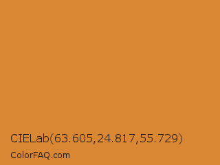 CIELab 63.605,24.817,55.729 Color is a normal orange color and the nearest color is Tigers Eye #e08d3c. Hex code #d98733 and RGB value is rgb(217,135,51). In RGB color space, this color is composed of 85% red, 53% green, 20% blue, In CMYK color space, this color is composed of 0% cyan, 38% magenta, 76% yellow , 15% black , In HSL color space, this color has a hue angle of 30° , 69% saturation and 53% lightness.